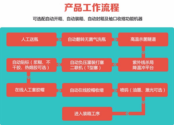 首先是人工送瓶→自動翻轉無菌氣洗瓶→高溫殺菌隧道→紫外線殺局降溫緩沖平臺→自動負壓灌裝打塞二聯機(T型塞)→自動貼標(漿糊、不干膠、熱熔膠可選)→在線人工套膠帽→自動在線膠帽收縮→噴碼(油墨、激光可選)→進入裝箱工序(可選配自動開箱、自動裝箱、自動封箱及袖口收縮功能機器)。