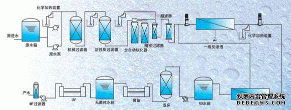 工業用的純凈水設備結構比較復雜,相關配套設備也比較片面,從上圖我們可以看到,光是預處置部分就有:原水箱、化學加藥裝置、原水泵、機器過濾、活性炭過濾、硬化器、精密過濾器、超濾器這些配套裝置,然后處置部分有:反滲透純水箱、混床交流罐、臭氧殺毒器、無菌水箱、UV光滅菌器、MF過濾器等,這里引見的這個設備結構是目前比較片面的一個工業純凈水設備的結構引見。