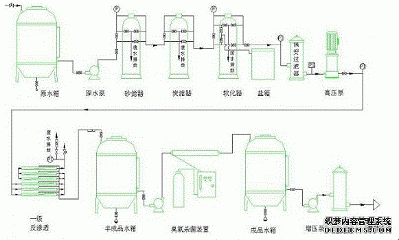 上圖所示的事工業純凈水設備的一個工藝流程引見圖,經過上圖觀察大家可以看到這款設備是一個單級反滲透設備,并且配套有專業的預處置部分跟后處置部分,大家看完這個工藝流程圖之后再看下面普通純真水設備就可以發現,普通純凈水設備在后處置的工藝上要比工業用純真水設備的要求要高,但是在預處置裝置上要復雜一點,詳細的可以將兩個工藝對比一下。
